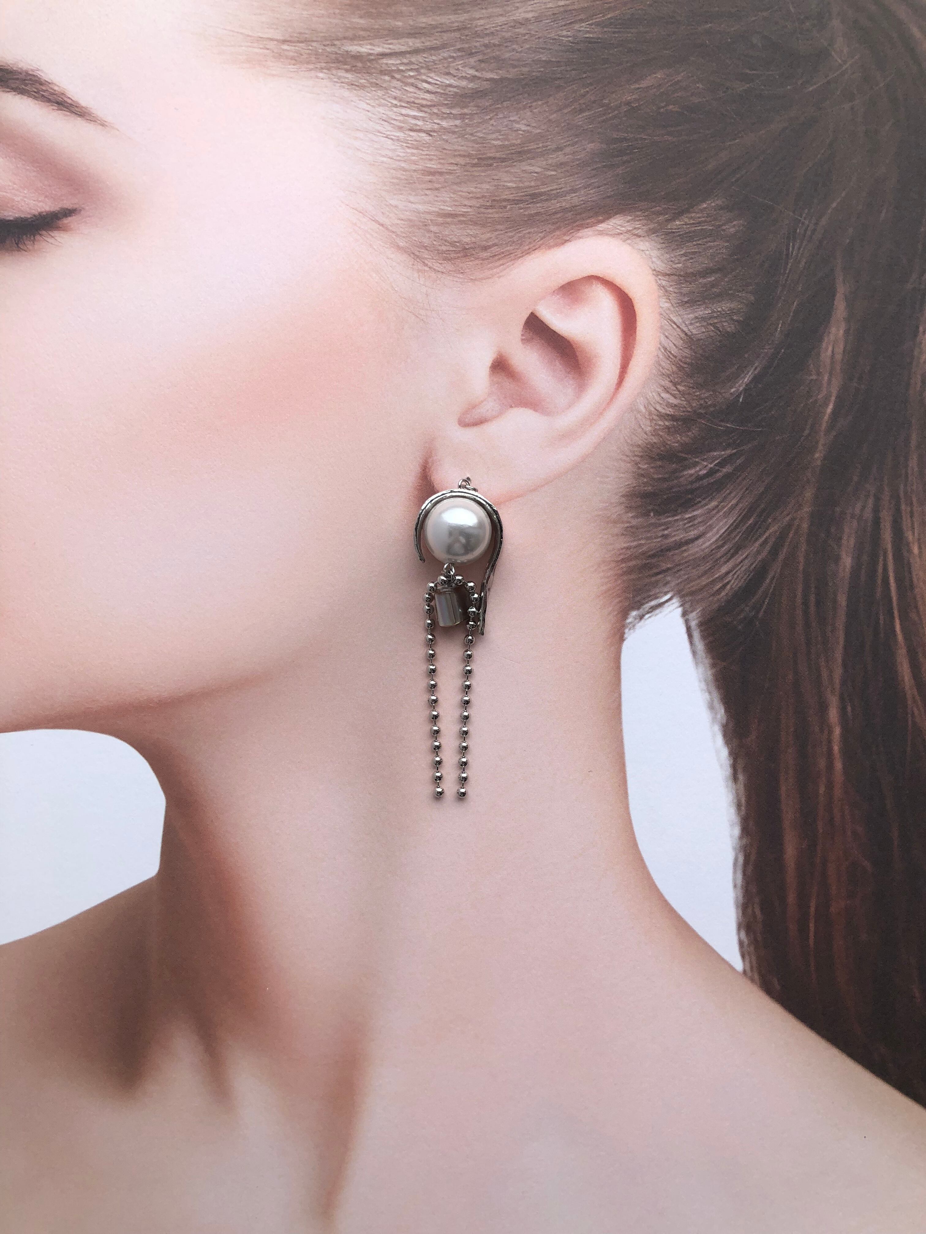 個性的なフック型パーツと大きめ樹脂パールのピアス・イヤリングです。