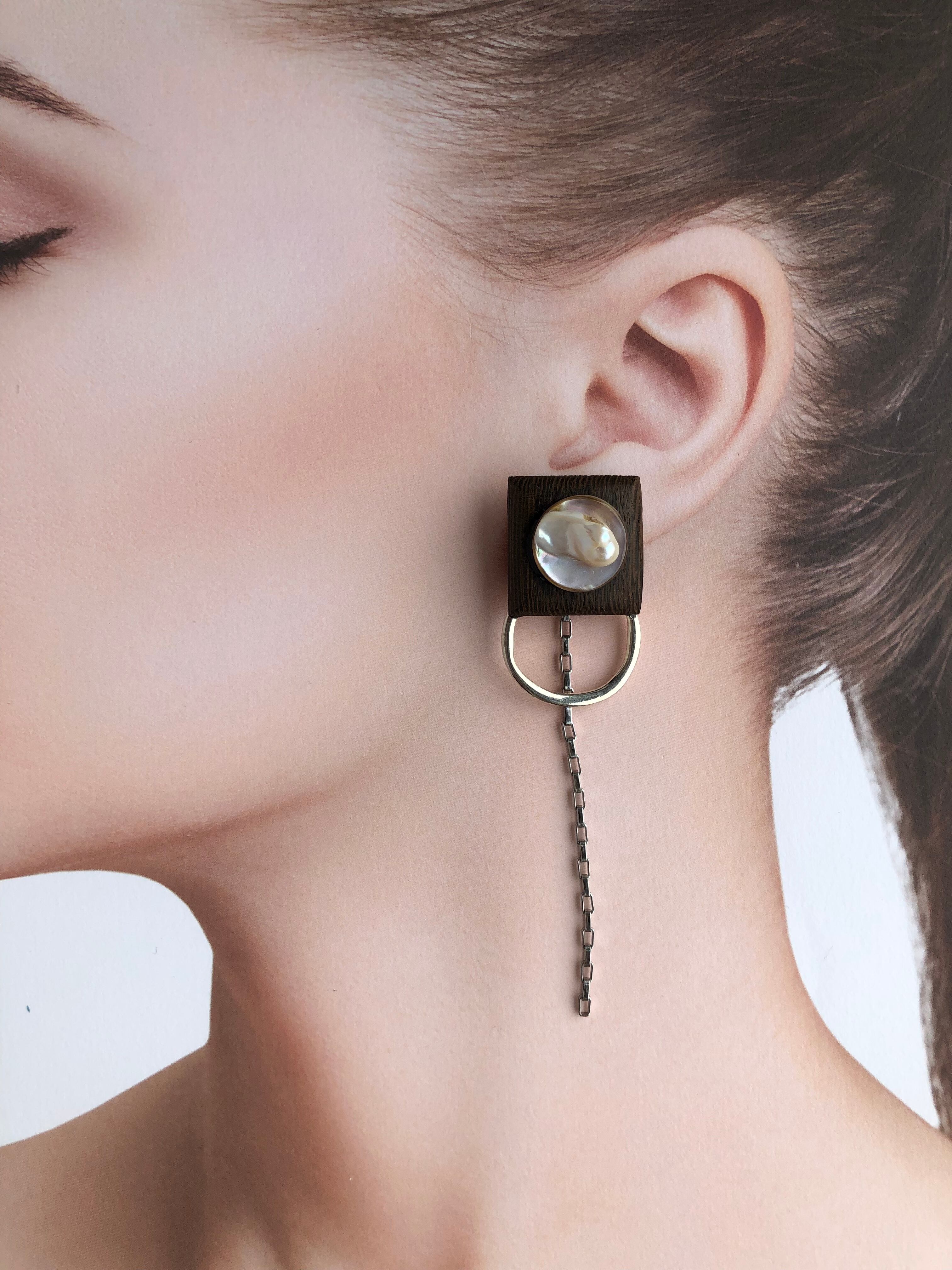 淡水パールと木とシルバーのクールなピアス・イヤリングです。